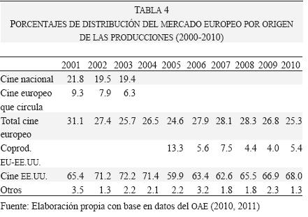 Si junto a los datos de producción ponemos en relación los datos de la cuota de mercado del cine en función de su nacionalidad (véase Tabla 4), entonces nos damos cuenta que la cuota de mercado de las producciones europeas disminuye en las salas de cine a pesar de que la producción aumenta considerablemente (véase Figura 1) y no sufre modificación de la tendencia a pesar de que en 2004 se produce la ampliación de la UE con la entrada de diez países del antiguo bloque de países de la Europa del Este. La cifra europea se mantiene en torno a 25%, con oscilaciones por encima o por debajo según el año.