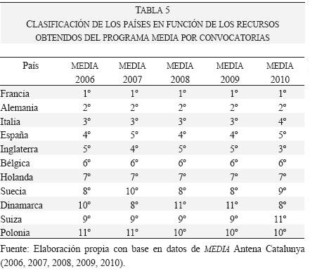 Si analizamos los resultados de las asignaciones de los recursos de las distintas convocatorias del programa MEDIA (véase Tabla 5), observamos que se refuerza la idea de que el programa ayuda a las cinco grandes industrias europeas (Alemania, España, Francia, Inglaterra e Italia), que consiguen dos tercios de la ayuda, mientras que los países pequeños quedan en posiciones posteriores y obtienen solo un tercio de los recursos. Este predominio de los cinco grandes países también se produce en el otro programa europeo de referencia de ayuda a la industria audiovisual, el EURIMAGES, del Consejo de Europa16 (De Vinck, 2009). Este dato puede tener una doble lectura: por un lado, fortalece la industria de los cinco grandes países, fundamental para poder construir una industria europea fuerte fuera de sus mercados de origen, y por otro, si el objetivo es fomentar una mayor proporción de obras de otros países fuera de los grandes, entonces la tendencia es que sigue manteniéndose en una minoría (aunque hay que apuntar que en algunos estados miembros existe poca tradición de producción audiovisual).