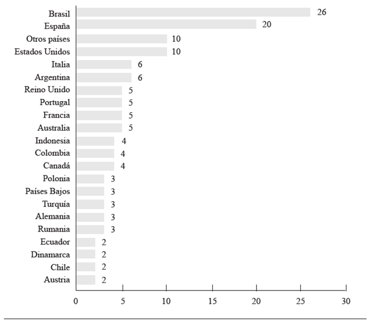 Y si bien España se posiciona como el cuarto país editor de revistas de esta área, con 10, todos los países de América Latina en conjunto aglutinan la misma cantidad de revistas (9) en SJR-Scopus, para esta área del conocimiento, tal como se muestra en la Tabla 2.
