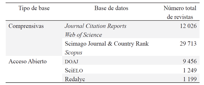 Tabla 1 Revistas en bases de datos Web of Sciencie, Scopus, comprensivas y de Acceso Abierto