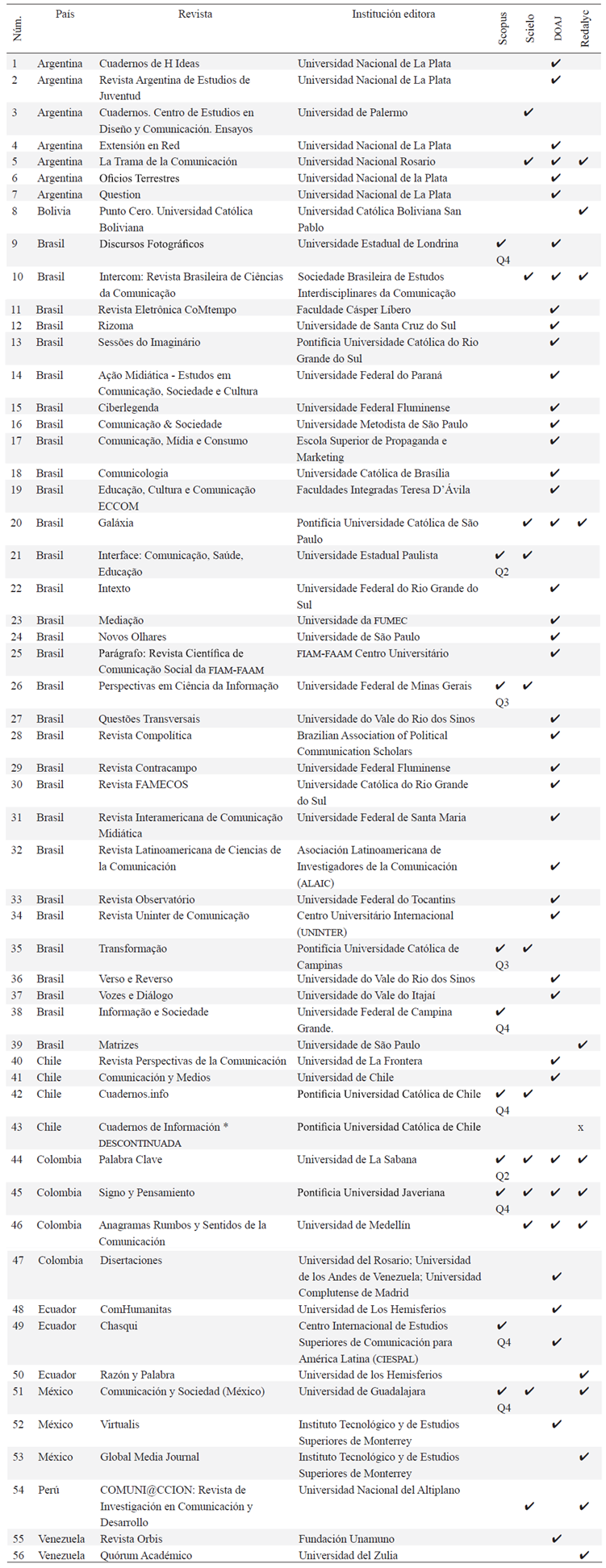 La mitad de las revistas latinoamericanas de comunicación registradas en Scopus son editadas en Brasil (5 de 10), dos más son editadas en Colombia y una en Chile, Ecuador y México respectivamente. Y si bien la revista ecuatoriana Chasqui es integrada en DOAJ como revista de comunicación, Scopus sí la registra pero en el área de Estudios Culturales (Q4) y en Literatura (Q3).