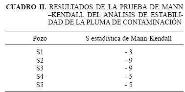 Para confirmar el análisis llevado a cabo por inspección visual de los datos del sitio con el tiempo (Fig. 2), se realizó un análisis estadístico de las tendencias de los datos. Para ilustrar lo anterior, el cuadro I muestra el cálculo de la S estadística de MannKendall para el pozo S2 para seis eventos de muestreo; estos son: octubre de 2000; abril, julio y octubre de 2001; mayo y octubre de 2002. Un valor positivo de S indicaría una tendencia en incremento y para uno negativo, la tendencia sería en decremento. En el cuadro II se presentan los resultados de los pozos ubicados a lo largo del eje principal de la pluma.