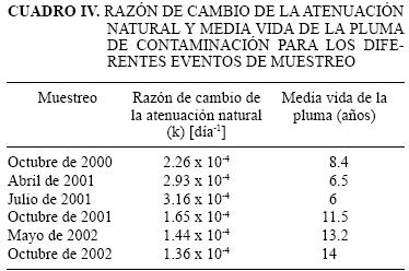 Los cálculos de la vida media de la pluma de contaminación, presentados en el cuadro IV, indican que al principio el tiempo en reducir las concentraciones de los contaminantes a la mitad, suponiendo que el contaminante en cuestión no fluirá más en la zona, va en decremento y conforme el tiempo pasa los procesos de atenuación natural se hacen más lentos.