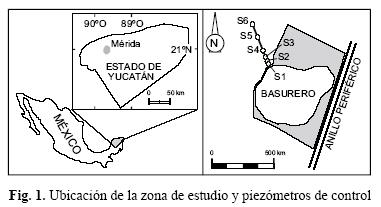 La ciudad de Mérida, Yucatán, cuenta con más de 700,000 habitantes (INEGI 2000). Desde 1979 hasta 1998 se acumularon residuos sólidos en un sitio localizado al noroeste de la ciudad (Fig.1), aunque durante el período 19791992 la basura se quemaba para su eliminación. El sitio se cerró en abril de 1998. Los residuos tienen principalmente origen urbano, aunque la gestión incontrolada y la existencia de otras industrias, favorecían la acumulación de residuos industriales y sanitarios. El basurero no se impermeabilizó en su base por lo que la precipitación pluvial en el lugar provoca que el lixiviado generado se infiltre hacia la roca subyacente (González et al. 2004).