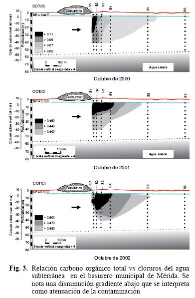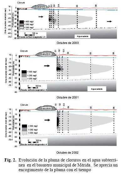 En la figura 2 se presentan curvas de isoconcentración para los meses representativos de la época de lluvias en la zona de estudio, octubre de 2000, 2001 y 2002, en las que se aprecia claramente que las plumas de cloruro se van encogiendo con el tiempo. Se deduce entonces que ocurre dilución y probablemente biodegradación en la pluma de contaminación conforme migra gradiente abajo.