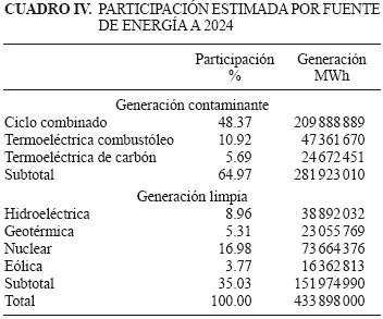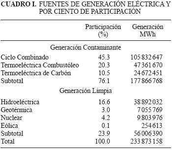 La energía eléctrica generada en 2008, así como la participación de las diferentes fuentes generadores de electricidad en México (CFE 2010), tanto de generación contaminante como de generación limpia, se muestran en el cuadro I.