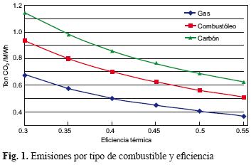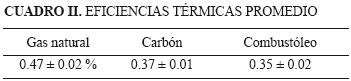 La cantidad de emisiones producidas por cada una de las fuentes generadores se determinó con los valores promedio de las eficiencias térmicas reales reportadas por el Centro Nacional de Control de Energía (CENACE) de la Comisión Federal de Electricidad, mostradas en el cuadro II, y las curvas de emisiones dadas por el sistema de datos primarios RETScreen (NRC 2010) de la figura 1.