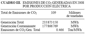 Los valores de el cuadro I y la figura 1 permitieron determinan las emisiones promedio dadas en el cuadro III. En dicho cuadro la generación de energía limpia corresponde al 23.9 % y el 76.1 % a la emisión contaminante. Para determinar la cantidad de toneladas de CO2 emitidas por MWh generado se divide a la cantidad de emisiones de CO2 entre la generación de electricidad producida en MWh.