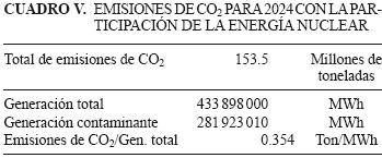 La menor cantidad de emisiones se obtiene con el uso de ciclos combinados que emiten 0.420 toneladas de CO2/MWh, así que este valor se consideró para cubrir la capacidad adicional requerida de acuerdo al POISE. De acuerdo al escenario propuesto con la instalación de los reactores nucleares, en el cuadro IV se muestra la distribución de fuentes generadoras para 2024 y allí se observa que se cumpliría con el 35 % de generación limpia establecido en la estrategia contra un 65 % de emisiones contaminantes. El cuadro V presenta las emisiones de dióxido de carbono que se obtendrían de acuerdo al escenario propuesto, las cuales serían de 0.354 Ton/MWh inferiores a las actuales que son de 0.466 Ton/MWh.