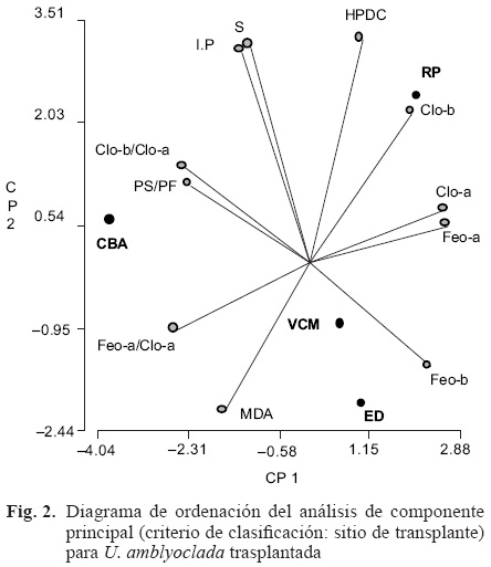 El PCA, empleando como criterio de clasificación los sitios, mostró que la primera componente está definida por el contenido de clorofila α, feofitina α, feofitina b, los índices entre pigmentos y la relación PS/PF; mientras que la segunda está determinada por el contenido de HPDC, la acumulación de azufre y los valores de IP (Cuadro II).