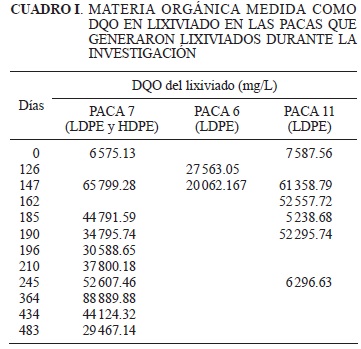En la investigación se encontró que la materia orgánica medida como DQO en el lixiviado alcanzó valores hasta 90 000 mg/L; en todos los casos los valores de DQO fueron disminuyendo en el transcurso del tiempo llegando a valores de 29 000 mg/L a los 15 meses. (Cuadro I).
