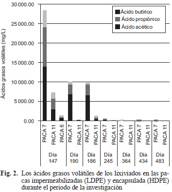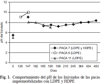 El pH que se obtuvo el día de la elaboración de las pacas fue de 5. Los valores de pH del lixiviado obtenido en las pacas impermeabilizadas y en la paca encapsulada fueron similares a partir del día 200 encontrándose en el rango de 7 a 8.2 (Fig. 1).