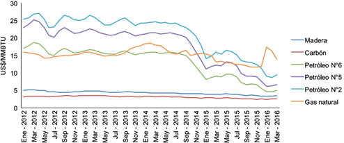Por otra parte, si las fuentes deciden realizar la sustitución de combustible, además de la inversión en calderas, deben enfrentar un diferencial de costos de operación asociado al diferencial del precio del combustible actual respecto al precio del gas natural. Tal como se aprecia en la figura 1 los precios (en millón de BTU, MMBTU) de la mayoría de los combustibles han evolucionado de forma similar a través del tiempo. Sin embargo, en los últimos años, a diferencia de la tendencia internacional en el mercado de los combustibles, el precio del gas natural ha tenido un comportamiento distinto debido a las restricciones de oferta que son particulares a la zona de estudio.
