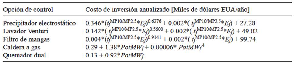 Las funciones de costo para cada tecnología de abatimiento, que dependen de las emisiones de cada fuente (E f ) y de la tasa de emisión entre MP10 y MP2.5 (t f MP10/MP2.5 ), son las mismas utilizadas por Mardones y Jiménez (2015). Por otra parte, Mardones et al. (2015) reportan una función de costo anualizado para la instalación de una caldera a gas natural y una función de costo anualizado para la instalación de un quemador dual, las cuales dependen de la potencia de la caldera (PotMW f ) (Cuadro II).