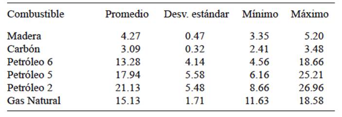 Fig. 1 Precios de los combustibles en dólares EUA por millón de unidades térmicas británicas (BTU). Fuente: Elaboración propia con base en el gasto en combustibles de la Encuesta Nacional Industrial Anual (ENIA) y variaciones en componentes energéticos del índice de precios al productor del Instituto Nacional de Estadísticas (INE)