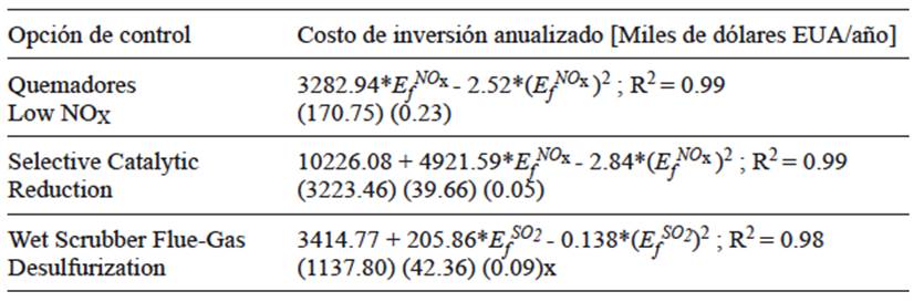 A partir de los manuales de la Agencia de Protección Ambiental de Estados Unidos (USEPA 2009) y de estudios técnico económicos se recopiló información sobre costos anualizados de quemadores: bajos en NOx-low NOX (LNB) y de reducción selectiva catalítica-selective catalytic reduction (SCR). Ambas tecnologías permiten la reducción de emisiones de NOX, así como los sistemas de desulfuración de gases de combustión-wet scrubber flue-gas desulfurization (FGD) que permiten reducir emisiones de SO2. Luego, se relacionaron los costos anualizados para diferentes niveles de reducción de emisiones, obteniendo las estimaciones para las funciones de costos que se presentan en el cuadro V.