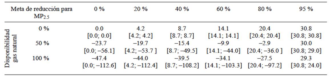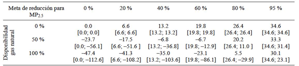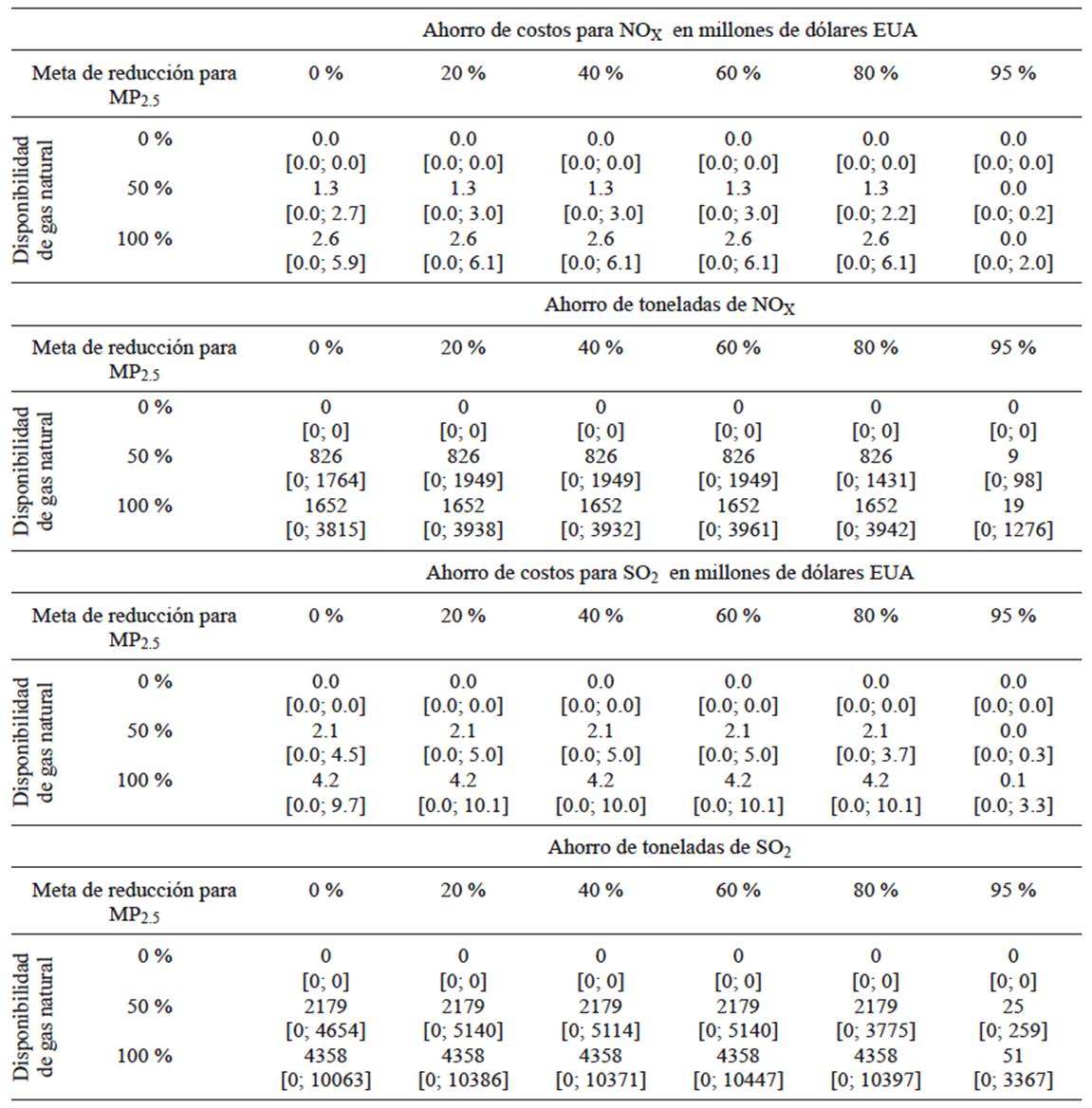 Bajo una disponibilidad de 100 % de gas natural y metas de reducción hasta 80 %, las emisiones de SO2 se ven reducidas en 4358 toneladas, lo que representa un 28.5 % de las emisiones totales de este contaminante según el inventario de emisiones, con un ahorro potencial de 4.2 millones de dólares. Para los mismos escenarios las emisiones de NOX se ven reducidas en 1652 toneladas, que representan un 20.3 % de las emisiones totales de este contaminante, con un ahorro de 2.6 millones de dólares. Sin embargo, si en las simulaciones se utilizan los precios mínimos, estas externalidades positivas desaparecen ya que las fuentes no sustituirían sus combustibles más contaminantes. Por el contrario, si se utilizan los precios máximos los beneficios económicos por reducción de SO2 y NOX se elevan a más del doble.