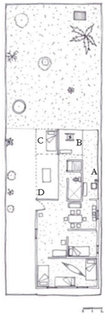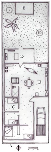 La construcción de la cocina en la parte trasera de la vivienda permite que tenga una ubicación estratégica porque hay un contacto visual con los vecinos y las demás cocinas, además de controlar visualmente todo el espacio y la entrada que comunica la calle con la vivienda. Alrededor de ésta se pueden encontrar algunas plantas ornamentales, aromáticas, medicinales y árboles frutales como papayo, cocotero, guayabo, rambután, limón, etcétera, muchos sembrados en semilleros, materas, bolsas y estructuras adecuadas rellenas de tierra, pues afirman que la tierra del solar tiene mucha laja.