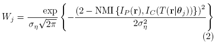 donde ση2 es la varianza del ruido en la medicion z, T (r|θ) es una transformación parametrica dependiente del vector θ, y NMI(·, ·) representa la información mutua normalizada [30] entre dos imágenes; esta medida de similitud ofrece el mejor desempeño para este metodo como se reporta en [31].