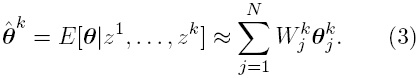 Los pesos Wj son utilizados para aproximar de forma iterativa la función de distribución de probabilidad a posteriori P(θ|z) de los parámetros desconocidos θ con respecto a una medición z [13, 32]. Ésta distribución se aproxima considerando una ventana de k mediciones (z1,...,zk), la cual es usada para estimar el vector de parámetros de la transformacion