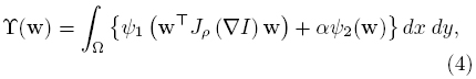 donde ψ1(·) es una funcion que penaliza el error en el termino de datos, ψ2(·) penaliza el término de regularización pesado por una constante positiva α, ∇I = (Ix,Iy,It)T es el gradiente de la imagen donde los subíndices representan las derivadas parciales, y dado un kernel Gaussiano Kρ(r) con desviación estandar ρ; la función Jρ(·) estó dada por