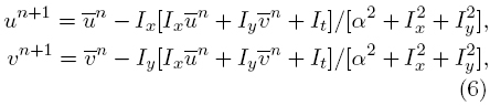 Para este trabajo, nuestro interés es observar el desempeño del algoritmo propuesto en la estimación del campo denso de desplazamientos, dado que no se está enfocando a una aplicación medica en específico, por lo que un metodo global resulta lo más viable para probar el desempeño de la propuesta. Entonces, tomando ψ1(·) como la identidad, ψ2(w) = |∇u|2 + |∇v|2, ρ = 0 y α > 0, se obtiene la técnica global de FO propuesta en [35], y de la cual se basa la mayoría de las propuestas globales existentes [24]. La solución al problema de optimización en (4) de acuerdo al planteamiento en [35], se encuentra resolviendo el sistema de ecuaciones en (6) para cada pixel, empleando para ello un método iterativo (por ejemplo Gauss-Seidel [36]):