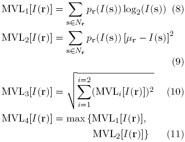 donde MVL1 representa la medida de variabilidad local usando la entropía, MVL2 empleando la varianza, MVL3 una ponderación Euclideana entre la varianza y la entropía en cada pixel, y MVL4 considerando el valor máximo entre la varianza y la entropía nuevamente por pixel. Además, Nr representa el conjunto de pixeles de una ventana centrada en r y tamaño n x n, pr (I(s)) es la distribucion de probabilidad de las intensidades de la imagen I(s) asociada a la ventana Nr, y μr es el valor esperado de las intensidades en la misma ventana, dado por