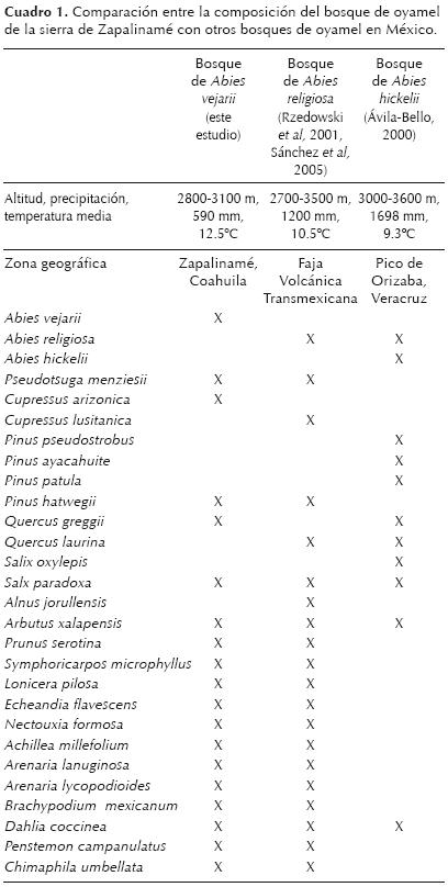 Composición florística. La flora vascular está integrada por 37 familias, 60 géneros y 73 especies, las familias con mayor riqueza son: Asteraceae (15 especies), Poaceae (5), Pinaceae (4), y Lamiaceae (4), los géneros con más especies son: Senecio (4), Ageratina (4), Quercus (3), Salvia (3), Pinus (2), Arenaria (2) y Euphorbia (2) (ver listado florístico en Anexo 1). Del total de las especies registradas las dicotiledóneas representan el 75.3%, las monocotiledóneas el 12.3% y el 12.3% pertenecen a las divisiones Pteridophyta y Pinophyta. En el cuadro 1, se compara la composición de los bosques de Abies vejarii, A. religiosa y A. hickelii, además de algunos aspectos ecológicos de estas comunidades; la lista de especies incluye a 28 taxa (17 árboles, 2 arbustos y 9 hierbas), los bosques presentan seis géneros y tres especies en común; la similitud a nivel de género entre los bosques de A. vejarii y los de A. religiosa, es 0.94 mientras que a nivel de especie es 0.69, por otra parte la similitud entre los bosques de A. vejarii y los de A. hickelii es 0.33 y 0.15 respectivamente.