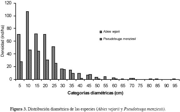 La figura 2 muestra la estructura diamétrica del bosque de oyamel de la sierra de Zapalinamé, donde la densidad se distribuye desde los 5 hasta los 95 cm de diámetro. La mayor densidad se concentra entre los 5 y 10 cm (431y 298 ind./ha respectivamente) ambas dominadas en orden descendiente por Quercus greggii, Abies vejarii y Pseudotsuga menziesii, mientras que en diámetros superiores a 30 cm, la densidad disminuye de manera importante y está dominada por Abies vejarii y Pseudotsuga menziesii.