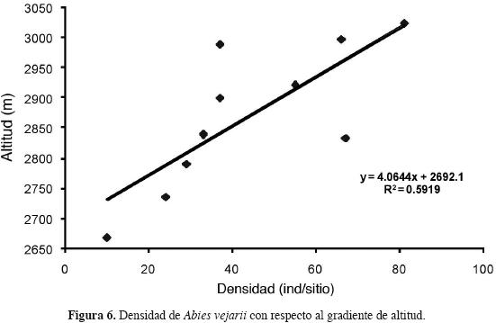 Aspectos ecológicos. La distribución altitudinal del bosque de oyamel se ubica dentro del rango de distribución de la mayoría de estas comunidades en México, así, Rzedowski (1978) describe bosques de oyamel en sitios con altitudes que van de 2,400 a 3,600 m; para bosques de Pseudotsuga, Pinus y Abies en la Sierra de Arteaga, Coahuila, CornejoOviedo (1987) reporta altitudes entre 2,700 y 3,360 m, de igual forma AguirreCalderón et al. (2003) en el cerro El Potosí describe un bosque de Abies, Pseudotsuga y Pinus en altitudes de 2,925 a 3,325 m. La distribución altitudinal de Abies vejarii en la sierra de Zapalinamé es superior a los bosques de Abies religiosa y A. religiosa var. emarginata, de la sierra de Manantlán, Jalisco, los cuales se desarrollan entre 2,187 a 2,261 m (FigueroaRangel y Moreno, 1993) y a los bosques de Abies guatemalensis de la sierra de San Carlos, Tamaulipas, que prosperan en altitudes de 1,300 a 1,400 m, en laderas con pendientes fuertes (Briones, 1991). La densidad y el área basal de Abies vejarii se incrementan notablemente conforme se aumenta la altitud, esta tendencia coincide con lo reportado por Cornejooviedo (1987); de igual forma AguirreCalderón et al. (2003) reportan para el cerro El Potosí, Nuevo León, bosque de oyamel con dominancia de Abies vejarii en sitios de 3,300 a 3,600 m de altitud, asimismo, ÁvilaBello y LópezMata (2001) en los bosques de Abies hickelii en México, registraron un incremento en la dominancia de esta especie en sitios con altitudes que oscilan entre los 3,000 y 3,600 m.