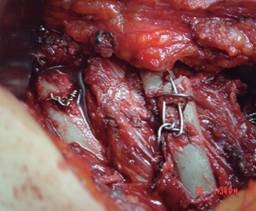 Se les realizó reducción abierta y fijación interna de las fracturas costales utilizando diferentes métodos. Técnica quirúrgica bajo intubación orotraqueal. Dependiendo de la localización de las fracturas, se seleccionó la posición del paciente, así como el tipo de incisión; en al menos un caso se utilizó la posición de decúbito dorsal. Se expusieron las fracturas, desperiostizando el sitio fracturado y evitando lo más posible la disección completa del músculo intercostal; siempre se trató de hacer un abordaje extrapleural; en algunos casos hubo necesidad de entrar a cavidad pleural para drenaje del hemotórax y/o reparar lesiones intratorácicas asociadas.