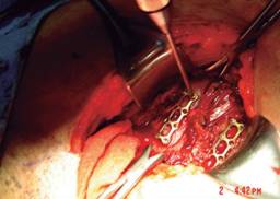 Figura 5: Visión intraoperatoria. A) Reducción abierta. B) Fijación interna con clips de titanio StraCos®.