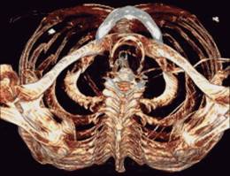 Figura 6: Reconstrucción tomográfica en 3D. Corte axial a nivel del opérculo torácico, presencia de rotoescoliosis y fracturas de arcos anteriores izquierdos.