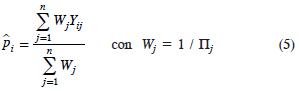 es la probabilidad de que el individuo j sea seleccionado en la muestra (probabilidad de inclusión del individuo j), y Yij es una variable indicadora con valor 1 si el individuo j pertenece a la categoría i y 0 en otro caso.