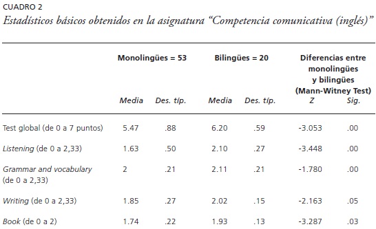 En los resultados de la asignatura Competencia comunicativa (inglés), hemos encontrado diferencias significativas, a favor de los bilingües, en todos los componentes de la evaluación, tanto en el test global como en cada una de sus partes (listening comprehension, grammar and vocabulary and writing). Lo mismo ha ocurrido en la presentación oral del libro leído (ver cuadro 2). Estos resultados son obvios si tenemos en cuenta que el grupo bilingüe ha recibido el 50% de la instrucción universitaria en inglés y ha desarrollado la competencia comunicativa en dicha lengua en mayor grado que los que recibieron la instrucción en la lengua materna (español).