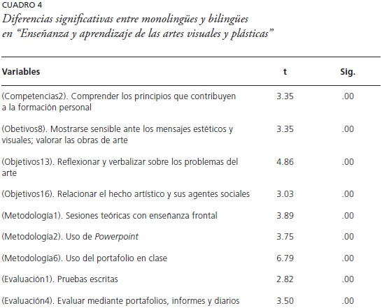 En el conjunto de las 39 variables relativas a la Guía docente de enseñanza y aprendizaje de las artes visuales y plásticas, hemos encontrado diferencias significativas entre monolingües y bilingües en 9 variables, como se puede apreciar en el cuadro 4. En los demás casos, no hay diferencias significativas entre los dos colectivos.