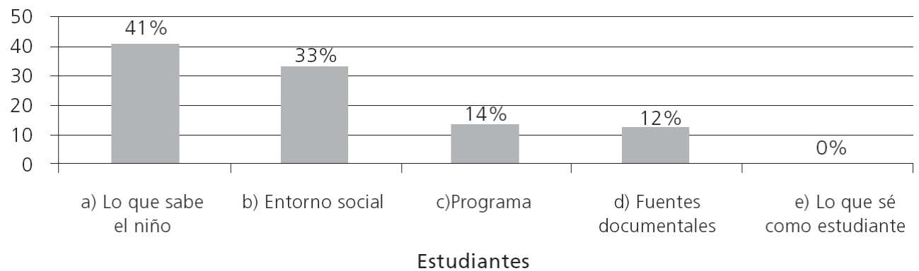Las estudiantes relacionan la frase "lo que sabe el niño y la niña" con los conocimientos previos, los intereses, las necesidades, los gustos, las ideas, los valores y las experiencias de los niños. Argumentan que es necesario considerar estas cuestiones porque son el diagnóstico que les permitirá ampliar lo que sus alumnos ya saben. Creen que si los niños no tienen los conocimientos previos sobre algo concreto, su responsabilidad es enseñárselos. De acuerdo con estos argumentos, las estudiantes creen que si la enseñanza de algún contenido parte de los conocimientos previos, será posible que se produzca un aprendizaje significativo. Los siguientes ejemplos muestran algunas opiniones.