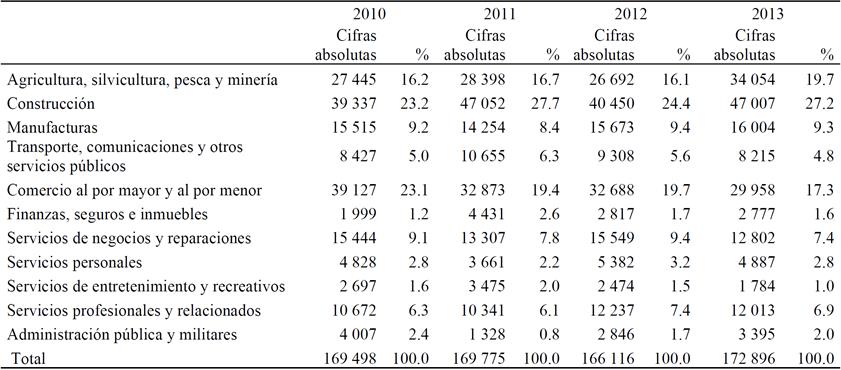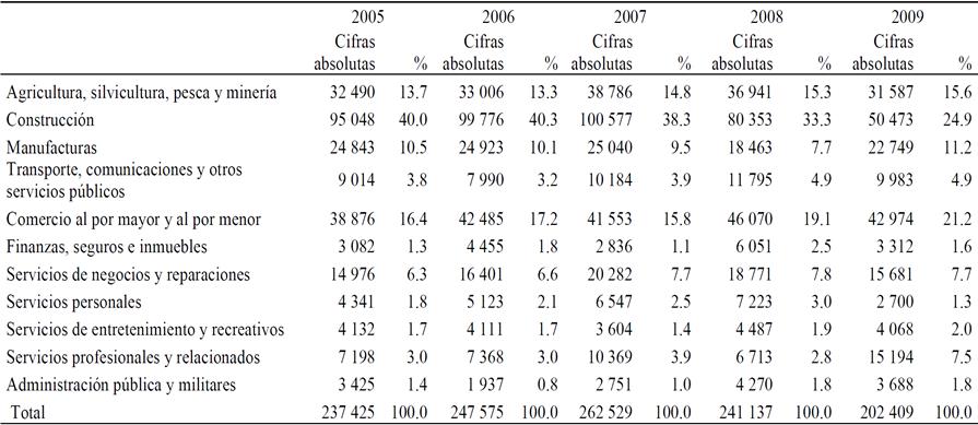 En el año 2007, aproximadamente 100 mil hombres mexicanos, 38.3 por ciento de esta población, estaban ocupados en el sector de la construcción; sector drásticamente afectado por la crisis económica. Tres años después, el número de hombres mexicanos empleados en ese sector se redujo a menos de la mitad, con un descenso aproximado de 60 mil empleos.