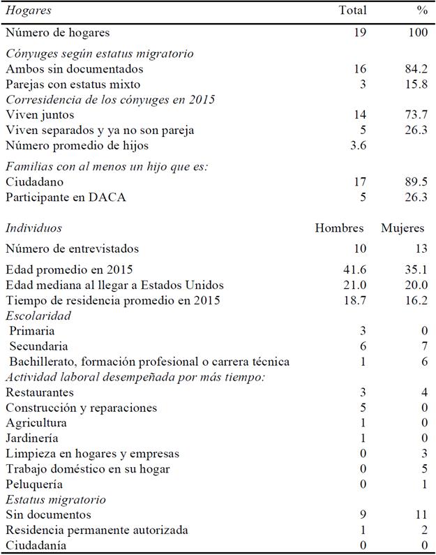 En el Cuadro 5 se destacan algunas características sociodemográficas de las personas y las familias que fueron entrevistadas. En lo que se refiere al estatus migratorio: en la mayoría de las familias ambos cónyuges carecían de la documentación requerida para residir y trabajar en Estados Unidos (84.2 por ciento de los casos); en casi todas había al menos un hijo nacido en territorio estadunidense (89.5 por ciento), y en poco más de una de cada cuatro (26.3 por ciento) alguno de los hijos se acogió a DACA (cuando estuvo en marcha el programa).