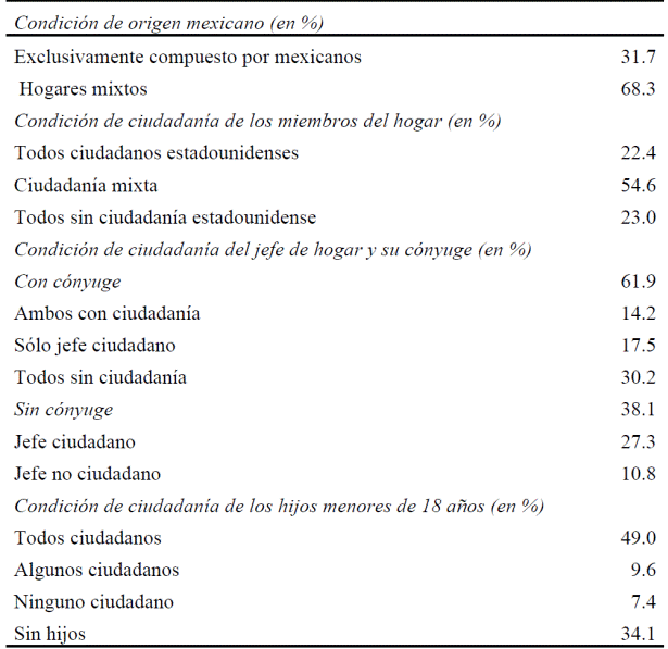 En Arizona, el número de hogares donde el jefe de familia y/o su cónyuge eran mexicanos ascendía a 261 321 (Cuadro 2). De ese conjunto, menos de una tercera parte estaban integrados exclusivamente por mexicanos, mientras que más de dos tercios estaban conformados por inmigrantes mexicanos y por ciudadanos estadunidenses, es decir, prevalecían los hogares en situación de ciudadanía mixta. En estos hogares, por lo general, mientras los progenitores carecían de la ciudadanía, los hijos la poseían por el hecho de haber nacido en territorio estadunidense. La información sistematizada en el Cuadro 2 muestra que casi la mitad de los hijos menores de 18 años residentes en hogares mexicanos en Arizona eran ciudadanos estadounidenses.