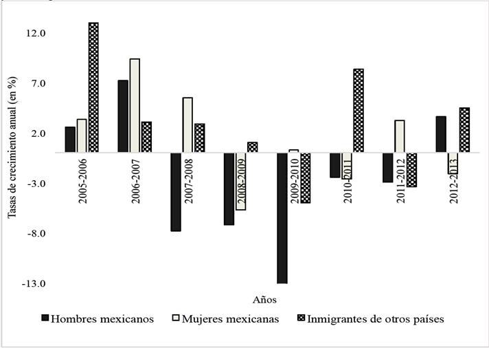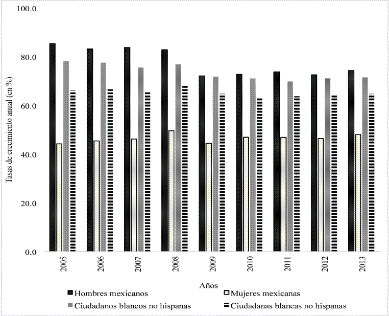La participación del conjunto de hombres inmigrantes mexicanos alcanzó su nivel más alto en el año 2007 y posteriormente experimentó una caída notable, que entre 2009 y 2010 llegó a ser de 13 por ciento. El crecimiento de la PEA de las mujeres mexicanas se desaceleró a partir del año 2010, y en el caso de los hombres mexicanos la disminución se hizo significativamente más lenta desde el periodo 2010-2011. A partir de 2011, las variaciones en el comportamiento del indicador pueden ser atribuidas a factores estructurales y coyunturales diferentes a los económicos (por ejemplo, las políticas anti-inmigrantes o algunas inercias demográficas). En general, se puede observar que los hombres mexicanos fueron los que tuvieron mayores caídas en todo el periodo. El descenso que va acumulando la PEA masculina, pudo estar asociado a una movilidad hacia otro estado.