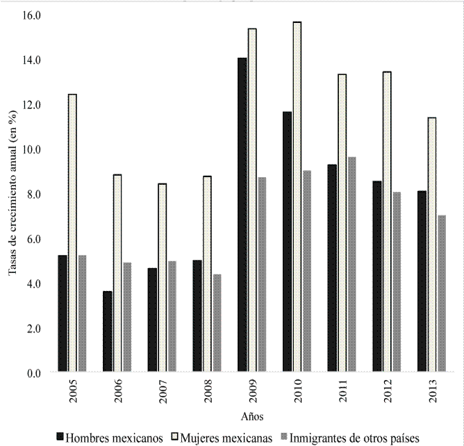 Después de ese año, la tendencia se revirtió y los hombres mexicanos alcanzaron niveles de desempleo muy semejantes a los del resto de inmigrantes; sin embargo, durante los años de la crisis se abrió una brecha mayor en el desempleo por parte de los varones mexicanos.