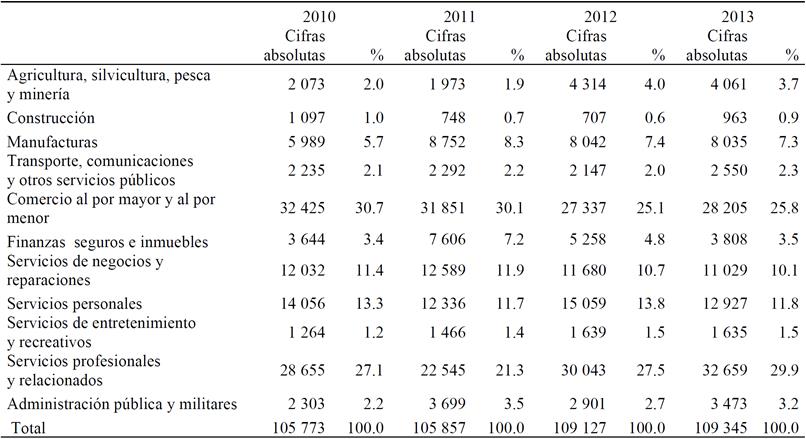 Cuadro 4d Distribución de la población masculina mexicana ocupada en Arizona por sector de actividad, 2010 a 2013.