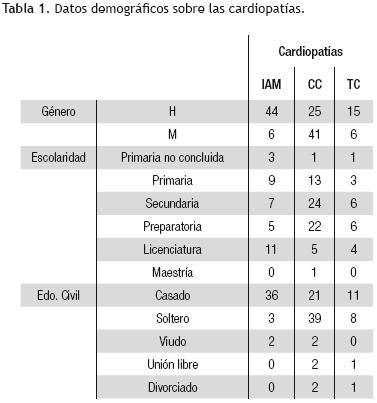 Se presentan los datos demográficos de la muestra total y por categorías cardiacas (Tabla 1). Hay una mayor proporción de pacientes masculinos, con excepción de las CC, en donde hay mayor número de mujeres. Sobre el nivel de escolaridad, se encontró que la mayoría cuenta con secundaria o preparatoria terminada (30.6% y 27.3%, respectivamente). El estado civil de los pacientes se concentra en casados (53.1%) y solteros (39.1%).