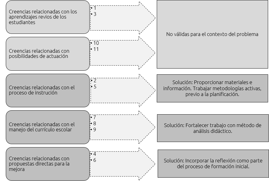Como síntesis de esta fase, la formadora elaboró el esquema que se presenta en la Figura 1, en donde clasificó las creencias en cinco categorías. Como resultado de la reflexión, consideró que dos de las categorías agrupaban creencias que no eran válidas para el contexto del problema. En cambio, las otras tres representaban creencias de las cuales se podía rescatar algún tipo de solución.