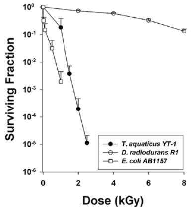 Figura 2. Supervivencia a radiación gamma de Deinococcus radiodurans en comparación con otras bacterias (Tomado de: Zimmerman JM y Battista JR: BMC Microbiol 2005 5:17).