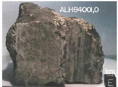 Figura 4 Meteorito ALH84001 proveniente de Marte. Meteoritos como éste son una prueba fehaciente de que el intercambio de fragmentos rocosos entre la Tierra y Marte, y tal vez entre la Tierra y otros planetas, ha ocurrido durante la historia del Sistema Solar. Foto: JSC, NASA.
