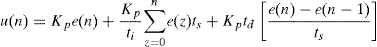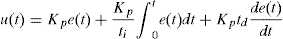 where e (t ) is the error signal, K p is the proportional gain, t i and t d are the integral and derivative time constants, respectively, and the derivative is with respect to time. The instantaneous error e (t ) is computed as the difference between the desired temperature and the actual (measured) temperature.