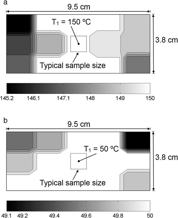 The spatial distribution of temperature on the surface of the 9.5 cm × 3.8 cm heating plate was experimentally investigated. Figure 10 shows contour plots generated from linear interpolations of the temperature measurements conducted on the heating plate as depicted in Figure 4. A reference temperature of 150 °C (at the center of the plate) was chosen to represent the spatial distribution of temperature during the heating phase, Figure 10a, while a reference temperature of 50 °C was chosen for the cooling phase, Figure 10b. For heating and cooling, the temperature distribution is rather uniform (variations are less than 10%) in a 5.7 cm × 3.8 cm zone of the heating plate. Furthermore, the measurements show that within a zone of 3.8 cm × 2.5 cm the temperature variations are less than 0.2 °C. The maximum variations (∼11%) occur at the corners of the plate, and the temperature at such zones should not be considered as representative of the central part of the heating plate. Since the oven was specifically designed for characterization of polymer nanocomposite samples whose typical dimensions do not exceed 1 cm × 1 cm, a homogenous distribution of temperature in the sample is expected to be achieved by using the constructed oven.