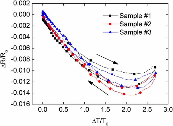 The initial resistance of the three samples tested (R 0 ) was in the range of 10 kΩ to 20 kΩ. Figure 11 shows the normalized change in electrical resistance (ΔR/R 0 ) as a function of the normalized change in temperature (ΔT/T 0 ) for three replicates. Quite consistent results are observed for the three replicates.